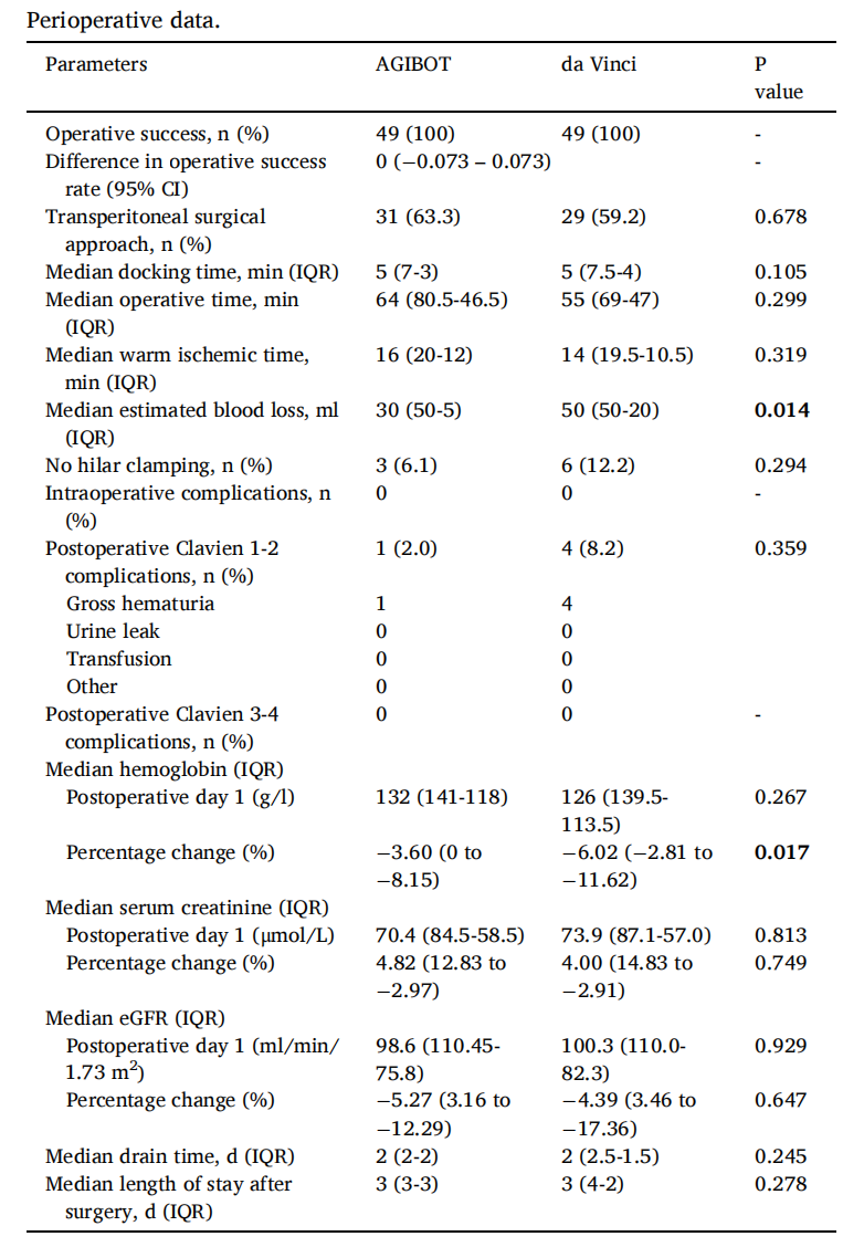 两组在机械臂对接时间、手术总时长、肾脏热缺血时间、术中及术后并发症发生率、术后肾功能保护等关键指标上,均无统计学差异。在肿瘤根治核心指标上,两组手术切缘阳性率均仅为2.0%,无统计学差异,证实AM1000系统可实现与进口系统完全相当的肿瘤根治效果。 更值得关注的是,AM1000展现出了更突出的微创优势:其中位术中估计失血量仅30mL,低于进口组的50mL(P=0.014);术后血红蛋白下降幅度中位数仅-3.60%,显著小于进口组的-6.02%(P=0.017),更少的术中出血、更轻微的术后指标波动,意味着更小的手术创伤、更快的术后恢复,将微创外科的优势充分展现。