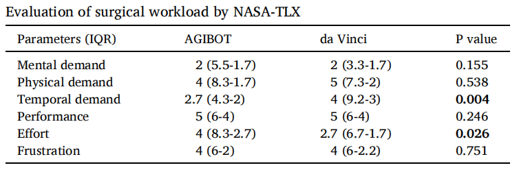 研究采用国际通用的NASA任务负荷指数(NASA-TLX),从6个维度全面评估了术者的操作体验。结果显示,AM1000与进口标杆产品相比,在脑力需求、体力需求、操作表现、挫败感等核心维度均无统计学差异,其中术者使用敏捷机器人时间需求评分显著更低,印证了系统快速对接、流畅操作的设计优势,可有效提升手术流程效率,获得了临床专家的高度认可