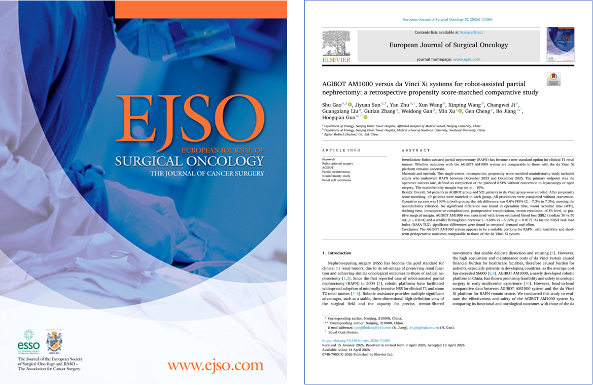 2026年4月,敏捷医疗科技(苏州)有限公司(以下简称“敏捷”)联合南京大学医学院附属南京鼓楼医院郭宏骞教授、江波主任团队开展的临床研究,正式在线发表于国际外科肿瘤领域权威 SCI 期刊《欧洲外科肿瘤学杂志》(European Journal of Surgical Oncology,简称 EJSO)。